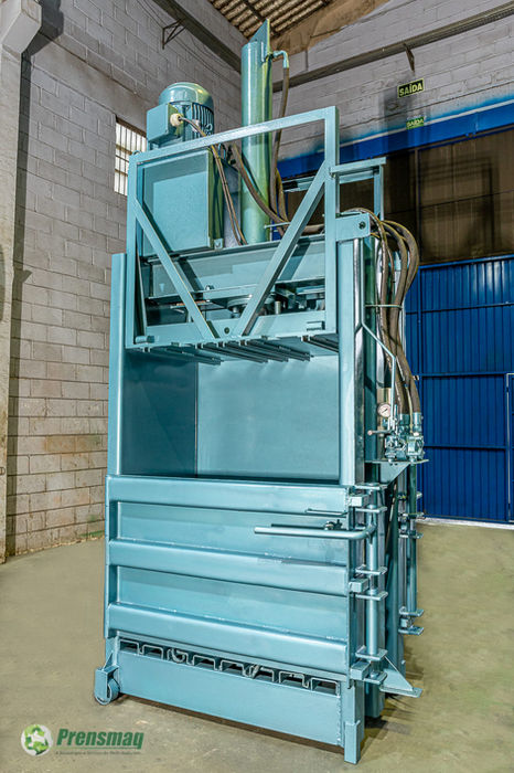 Veja a Prensa Enfardadeira Vertical em operação, ideal para compactar materiais como papéis e plásticos